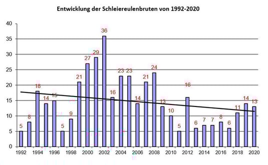 Besonders starke Rückschläge erkennt man in der Regel nach Wintern mit langanhaltend geschlossener Schneedecke in den Flussniederungen. Auch nach dem Hochwasserereignis 2013 war ein deutlicher Rückschlag erkennbar. Es kann viele Jahre dauern, bis sich die Schleiereulenpopulation wieder erholt hat.